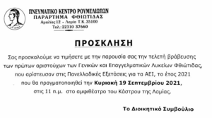 Το Πνευματικό Κέντρο Ρουμελιωτών – Παράρτημα Φθιώτιδας, θα πραγματοποιήσει φέτος την καθιερωμένη βράβευση των πρώτων αριστούχων από κάθε ΓΕΛ και ΕΠΑΛ του νομού μας για την επιτυχία τους στις Εξετάσεις για τα ΑΕΙ στο χώρο του Κάστρου Λαμίας την Κυριακή 19 Σεπτεμβρίου και ώρα 11π.μ. με όλα τα απαραίτητα μέτρα προστασίας κατά του covid.