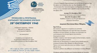Ο Δήμαρχος Στυλίδας Αποστόλου Ιωάννης και το Δημοτικό Συμβούλιο σας προσκαλούν να τιμήσετε με την παρουσία σας τις εορταστικές εκδηλώσεις του Δήμου Στυλίδας για την Εθνική Επέτειο της 28ης Οκτωβρίου 1940. Πρόγραμμα Εορτασμού Εθνικής Επετείου Γενικός σημαιοστολισμός Δημοσίων Κτιρίων, Τραπεζών και ιδιωτικών καταστημάτων-οικιών από την 8η πρωινή ώρα της 27ης Οκτωβρίου 2025, έως τη δύση …