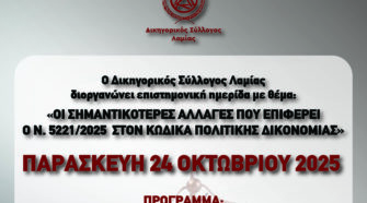 Ο Δικηγορικός Σύλλογος Λαμίας, διοργανώνει επιστημονική ημερίδα με θέμα “ ΟΙ ΣΗΜΑΝΤΙΚΟΤΕΡΕΣ ΑΛΛΑΓΕΣ ΠΟΥ ΕΠΙΦΕΡΕΙ Ο Ν.5221/2025 ΣΤΟΝ ΚΠΟΛΔ”, την Παρασκευή 24-10-2025 και ώρα έναρξης 18:00 μμ στην αίθουσα εκδηλώσεων της ΔΕΥΑΛ (Α. Παπανδρέου & Τ. Ισαάκ – Λαμία). Ο Πρόεδρος του ΔΣΛ Αθανάσιος Δ. Μακρυγιάννης