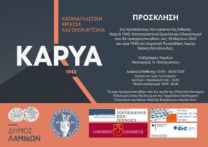 Ο Δήμος Λαμιέων και η Δημοτική Πινακοθήκη Λαμίας «Αλέκος Κοντόπουλος» φιλοξενούν από τις 10 Μαρτίου 2026 έως 30 Απριλίου 2026 την Έκθεση Συλλογικής Ιστορικής Μνήμης «Καρυά 1943Καταναγκαστική εργασία και Ολοκαύτωμα».