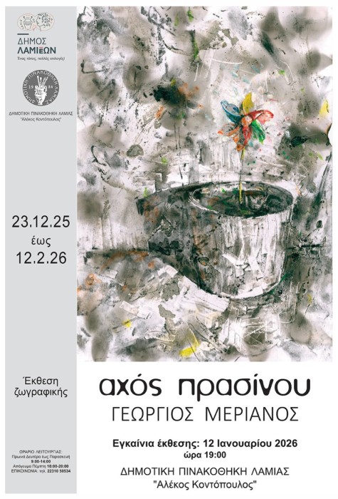 Ο Δήμος Λαμιέων και η Δημοτική Πινακοθήκη Λαμίας «Αλέκος Κοντόπουλος» διοργανώνουν Έκθεση Ζωγραφικής του εικαστικού Γιώργου Μέριανου, με τίτλο: «Αχός Πρασίνου» στην κύρια αίθουσα της Δημοτικής Πινακοθήκης Λαμίας «Αλέκος Κοντόπουλος», από τις 23 Δεκεμβρίου 2025 έως τις 12 Φεβρουαρίου 2026.