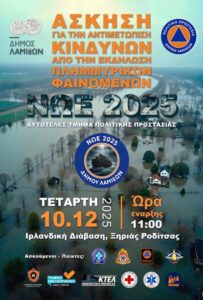 Ο Δήμος Λαμιέων διοργανώνει την Τετάρτη 10 Δεκεμβρίου 2025 στις 11:00 π.μ. την επιχειρησιακή άσκηση πεδίου «ΝΩΕ 2025», που θα πραγματοποιηθεί στην Ιρλανδική Διάβαση του Ξηριά στη Ροδίτσα.
