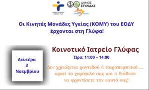 Με τη συνεργασία του Δήμου Στυλίδας και του προγράμματος «Βοήθεια στο Σπίτι», οι Κινητές Ομάδες Υγείας του ΕΟΔΥ θα βρίσκονται τη Δευτέρα 3 Νοεμβρίου, από 11:00 έως 14:00, στο Κοινοτικό Ιατρείο Γλύφας, για να προσφέρουν δωρεάν προληπτικές εξετάσεις σε όλους τους κατοίκους της περιοχής.