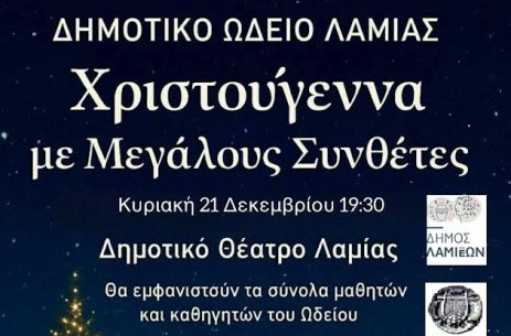 Η κεντρική Χριστουγεννιάτικη Συναυλία του Δημοτικού Ωδείου Λαμίας θα πραγματοποιηθεί την Κυριακή 21 Δεκεμβρίου 2025 και ώρα 19:30 στο Δημοτικό Θέατρο Λαμίας.