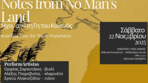 Ο Δήμος Λαμιέων και το Δημοτικό Ωδείο Λαμίας σε συνεργασία με την Performart το Σάββατο 22 Νοεμβρίου 2025 και ώρα 20:00 παρουσιάζει στην αίθουσα συναυλιών «Αλέξανδρος Αινιάν» το μουσικό πρόγραμμα «Notes from No Man’s Land: Boarding Time for Music Departures», έναν κύκλο συναυλιών αφιερωμένο στη σύγχρονη μουσική δημιουργία και στις πολιτιστικές διαδρομές που ενώνουν διαφορετικούς τόπους και εποχές μέσα από τον ήχο.