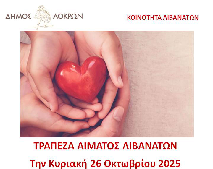 Ο Δήμος Λοκρών σε συνεργασία με την Κοινότητα Λιβανατών ανακοινώνουν ότι την Κυριακή 26 Οκτωβρίου 2025 θα πραγματοποιηθεί Εθελοντική Αιμοδοσία στο Δημοτικό Κατάστημα Λιβανάτων από τις 09:30 έως τις 13:30