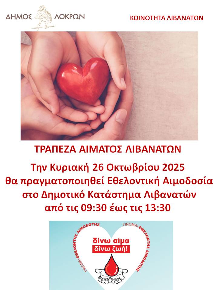 Ο Δήμος Λοκρών σε συνεργασία με την Κοινότητα Λιβανατών ανακοινώνουν ότι την Κυριακή 26 Οκτωβρίου 2025 θα πραγματοποιηθεί Εθελοντική Αιμοδοσία στο Δημοτικό Κατάστημα Λιβανάτων από τις 09:30 έως τις 13:30