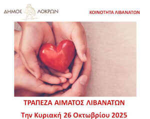 Ο Δήμος Λοκρών σε συνεργασία με την Κοινότητα Λιβανατών ανακοινώνουν ότι την Κυριακή 26 Οκτωβρίου 2025 θα πραγματοποιηθεί Εθελοντική Αιμοδοσία στο Δημοτικό Κατάστημα Λιβανάτων από τις 09:30 έως τις 13:30