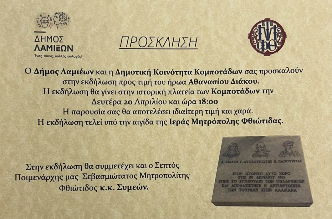 Ο Δήμος Λαμιέων σε συνεργασία με την Δημοτική Κοινότητα Κομποτάδων, στο πλαίσιο των εκδηλώσεων προς τιμήν του ήρωα Αθανασίου Διάκου και της επετείου της μάχης της Αλαμάνας, διοργανώνει «Εκδήλωση προς τιμήν του ήρωα Αθανασίου Διάκου» που θα πραγματοποιηθεί την Δευτέρα 20 Απριλίου 2026 και ώρα 18.00 στην ιστορική πλατεία Κομποτάδων, υπό την αιγίδα της Ιεράς Μητρόπολης Φθιώτιδας.