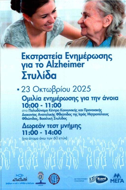 Με την προτροπή του Σεβασμιωτάτου Μητροπολίτου Φθιώτιδος κ. Συμεών και την ευλογία του Μακαριωτάτου Αρχιεπισκόπου Αθηνών κ. κ. Ιερωνύμου του Β΄ ο Φιλανθρωπικός Οργανισμός «ΑΠΟΣΤΟΛΗ» της Ιεράς Αρχιεπισκοπής Αθηνών, στο πλαίσιο της Εκστρατείας Ενημέρωσης και Ευαισθητοποίησης για το Alzheimer, αύριο Πέμπτη 23η Οκτωβρίου 2025 στο Πολυδύναμο Κέντρο Κοινωνικής και Προνοιακής Διακονίας Ανατολικής Φθιώτιδος της Ιεράς Μητροπόλεως Φθιώτιδος, στην Βασιλική Στυλίδος, όπου θα χορηγηθούν δωρεάν τεστ μνήμης σε άτομα άνω των 60 ετών από το επιστημονικό προσωπικό του «Καρέλλειου–Μονάδα Alzheimer» του Φιλανθρωπικού Οργανισμού «ΑΠΟΣΤΟΛΗ», ενώ θα πραγματοποιηθεί και ενημερωτική ομιλία σε σχέση με τη νόσο Alzheimer.