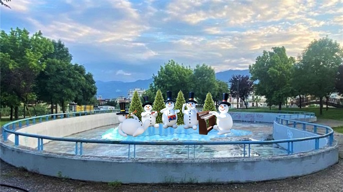 Μέσα στη λίμνη προτείνουμε να μπει η μεγάλη σύνθεση της μπάντας των χιονάνθρωπων. Θα είναι σε βάση (πολυστερίνης ή εξέδρας) ώστε αν μπει νερό να φαίνονται πλωτοί.