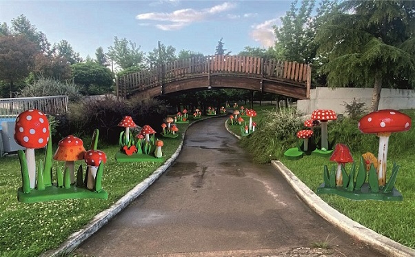 Για τον δρόμο που περνά κάτω από τη γέφυρα προτείνονται οι συνθέσεις μανιταριών, τοποθετημένες έτσι ώστε να φαίνονται από μπροστά και προοπτικά να ΄΄σβήνουν΄΄ βάθος του δρόμου. Προτείνονται 10 συνθέσεις των 3 μανιταριών με φύλλα.