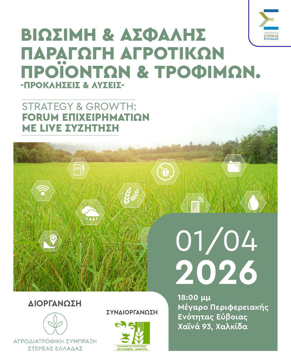 Ο Αντιπεριφερειάρχης Ανάπτυξης & Επιχειρηματικότητας και Πρόεδρος του Δ.Σ. της Αγροδιατροφικής Σύμπραξης Περιφέρειας Στερεάς Ελλάδας κ Κωνσταντίνος Γαλάνηςσας προσκαλεί να τιμήσετε με την παρουσία σας την Ημερίδα με θέμα: ΒΙΩΣΙΜΗ ΚΑΙ ΑΣΦΑΛΗΣ ΠΑΡΑΓΩΓΗ ΑΓΡΟΤΙΚΩΝ ΠΡΟΙΟΝΤΩΝ ΚΑΙ ΤΡΟΦΙΜΩΝ :ΠΡΟΚΛΗΣΕΙΣ ΚΑΙ ΛΥΣΕΙΣ