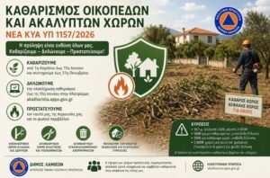 Με αφορμή τη δημοσίευση της Κοινής Υπουργικής Απόφασης ΥΠ 1157/2026 (ΦΕΚ 2323/Β/24‑4‑2026), το Αυτοτελές Τμήμα Πολιτικής Προστασίας του Δήμου Λαμιέων υπενθυμίζει στους πολίτες – ιδιοκτήτες, νομείς, επικαρπωτές, μισθωτές και υπομισθωτές– τις υποχρεώσεις τους σχετικά με την προληπτική πυροπροστασία οικοπεδικών και λοιπών ακάλυπτων χώρων, για την αποφυγή κινδύνου πρόκλησης ή ταχείας επέκτασης πυρκαγιάς.