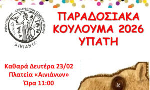 «Καλώς την Σαρακοστή… την Καθαρή Δευτέρα» θα τραγουδήσουν και φέτος «οι Αινιάνες», με την υποστήριξη του Δήμου Λαμιέων, αναβιώνοντας τα πατροπαράδοτα Κούλουμα στην κεντρική πλατεία της Υπάτης την Καθαρά Δευτέρα 23 Φεβρουαρίου 2026 και ώρα 11:00.