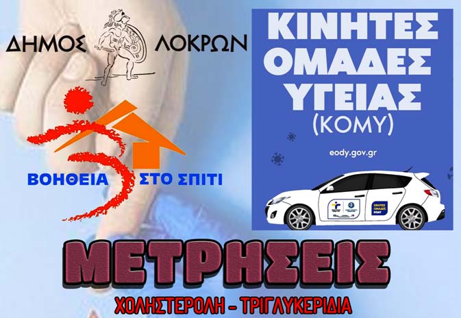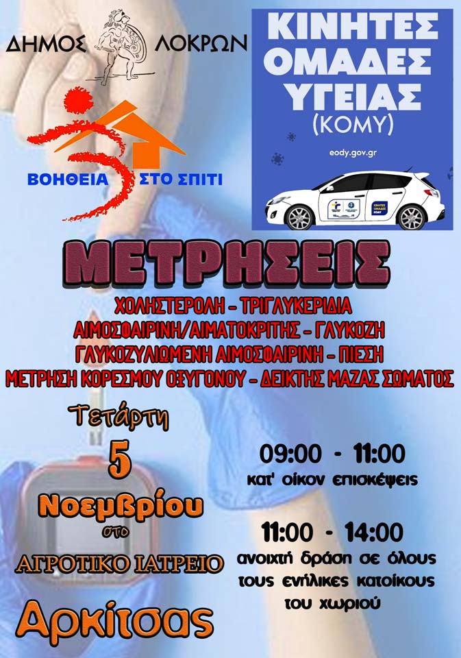 Ο Δήμος Λοκρών σε συνεργασία με τις Κινητές Ομάδας Υγείας (ΚΟΜΥ) και το «Βοήθεια στο Σπίτι» θα πραγματοποιήσουν την Τετάρτη 5 Νοεμβρίου στο Αγροτικό Ιατρείο Αρκίτσας μετρήσεις ζωτικών σημείων και συγκεκριμένα για: