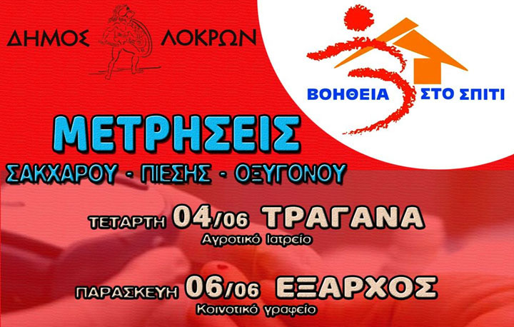 O Δήμος Λοκρών σε συνεργασία με το Βοήθεια στο Σπίτι του Δήμου πραγματοποιεί μετρήσεις σακχάρου, πίεσης, οξυγόνου κατά τη διάρκεια όλου του μήνα Ιουνίου σε περιοχές του Δήμου Λοκρών.