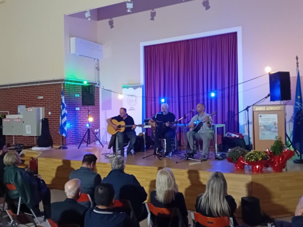 Το κοινό είχε την ευκαιρία να ταξιδέψει μέσα από ένα αυθεντικό λαϊκό–ρεμπέτικο μουσικό αφιέρωμα, που παρουσίασαν οι καλλιτέχνες κ. Χρήστος Ανωγειανάκης, κ. Παναγιώτης Γιαννακάκης και κ. Αλέκος Μπίχας. Οι μελωδίες πλημμύρισαν την αίθουσα, αναδεικνύοντας την πολιτιστική παράδοση και τη μνήμη που συνδέεται με το ιστορικό Δημαρχείο Δομοκού.
