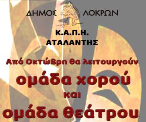 Οι εγγραφές των μελών του ΚΑΠΗ Αταλάντης ξεκίνησαν για την ομάδα χορού και την ομάδα θεάτρου. Δικαίωμα συμμετοχής έχουν όλα τα μέλη του ΚΑΠΗ.