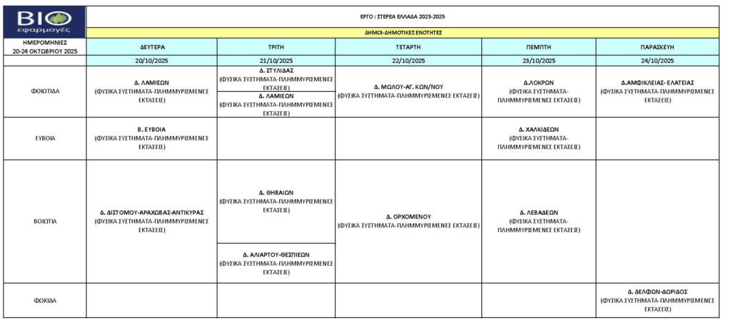 Το εβδομαδιαίο πρόγραμμα παρεμβάσεων κουνουποκτονίας που θα ακολουθήσουν τα συνεργεία της εταιρείας “ΒΙΟΕΦΑΡΜΟΓΕΣ Ο.Ε.” κατά την περίοδο 20–24 Οκτωβρίου 2025.