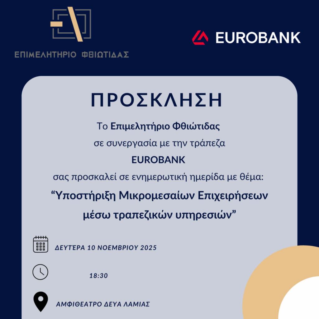 Στο πλαίσιο της συνεχούς στήριξης των Μικρομεσαίων Επιχειρήσεων της περιοχής μας, το Επιμελητήριο Φθιώτιδας σε συνεργασία με την EUROBANK διοργανώνει ενημερωτική ημερίδα με θέμα: