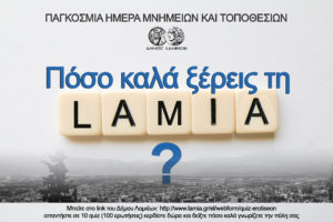 Ο Δήμος Λαμιέων με αφορμή την Παγκόσμια Ημέρα Μνημείων και Τοποθεσιών διοργανώνει έναν πρότυπο online διαγωνισμό με τίτλο «ΠΟΣΟ ΚΑΛΑ ΞΕΡΕΙΣ ΤΗ ΛΑΜΙΑ;». Μια πρωτοβουλία του Δήμου Λαμιέων σε συνεργασία με επιχειρήσεις της πόλης μας (Euronics Αναστασίου [1], Electronet – Δαμακόπουλος [2], Public Λαμίας [3], grammi.com –Γραμματίκας Δ.Γ. & ΣΙΑ Ε.Ε [4]).