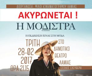 Σας ενημερώνουμε ότι η προγραμματισμένη προβολή της Τρίτης 28/2/2017 “Η Μοδίστρα” δυστυχώς ακυρώνεται λόγω χρήσης του Δημοτικού Θεάτρου για άλλο πολιτιστικό σκοπό.