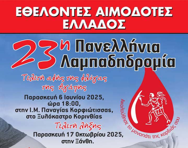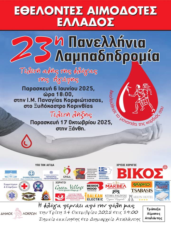 Ο Δήμος Λοκρών και η Τράπεζα Αίματος Αταλάντης σας προσκαλούν να συμμετέχετε στην 23η Πανελλήνια Λαμπαδηδρομία Εθελοντών Αιμοδοτών την Τρίτη 14 Οκτωβρίου 2025 στις 19:00.