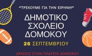 Την Πέμπτη 26 Σεπτεμβρίου, το Δημοτικό Σχολείο Δομοκού συμμετέχει ενεργά στον εορτασμό της 12ης Πανελλήνιας Ημέρας Σχολικού Αθλητισμού, με κεντρικό σύνθημα «Τρέχουμε για την Ειρήνη».