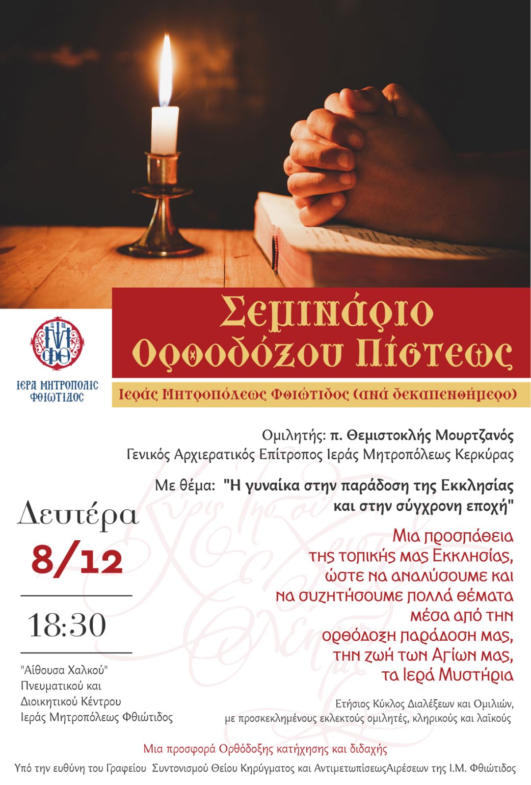 Σ’ αυτή την σύναξη μας θα έχουμε την χαρά και την τιμή, να φιλοξενήσουμε ως εισηγητή, έναν έγκριτο ομιλητή, τον Αιδεσιμολογιώτατο Πρωτοπρεσβύτερο π. Θεμιστοκλή Μουρτζανό, Γενικό Αρχιερατικό Επίτροπο Ιεράς Μητροπόλεως Κερκύρας με θέμα ομιλίας: «Η γυναίκα στην παράδοση της Εκκλησίας και την σύγχρονη εποχή».