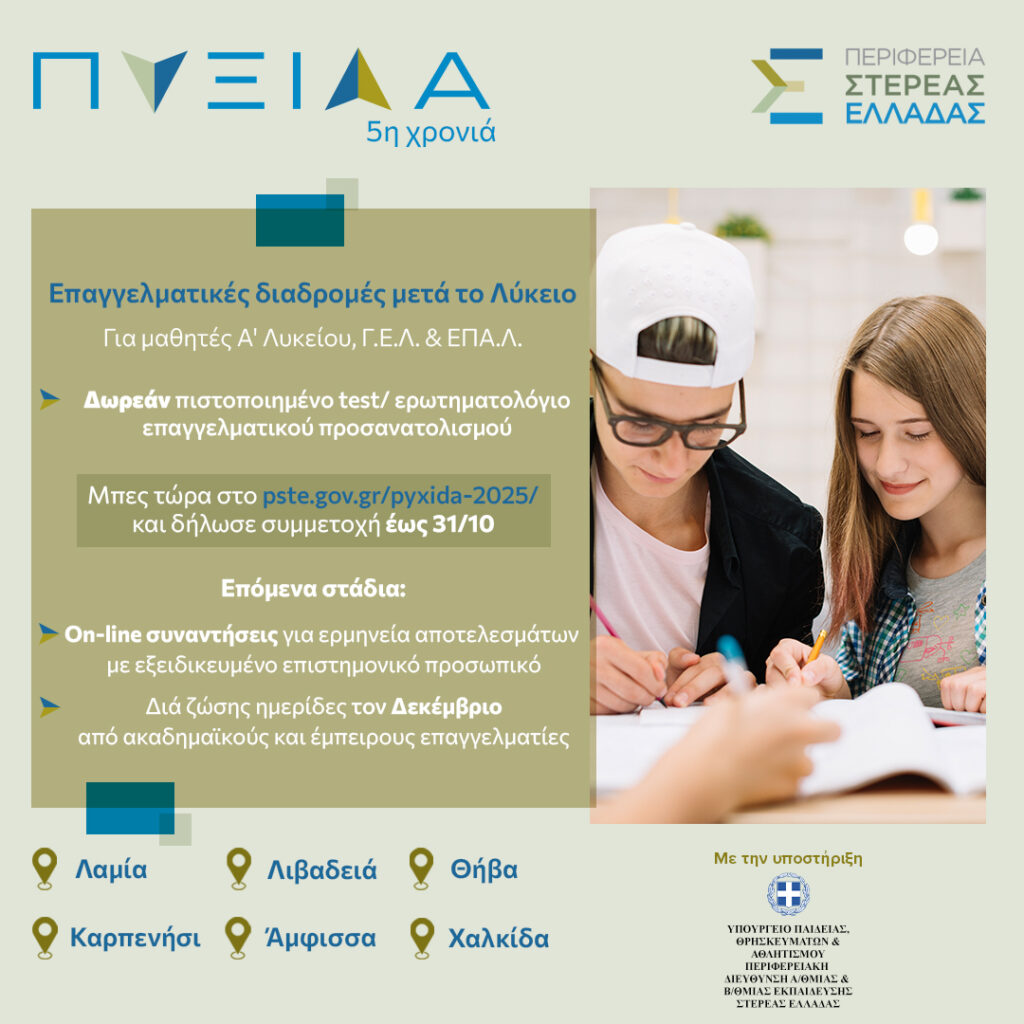 Η Περιφέρεια Στερεάς Ελλάδας για 5ησυνεχή χρονιά ενεργοποιεί την «ΠΥΞΙΔΑ». Ένα απολύτως χρήσιμο εργαλείο για να καταφέρουν οι μαθήτριες και οι μαθητές να ανακαλύψουν τις δεξιότητές τους και τα επαγγελματικά τους ενδιαφέροντα.