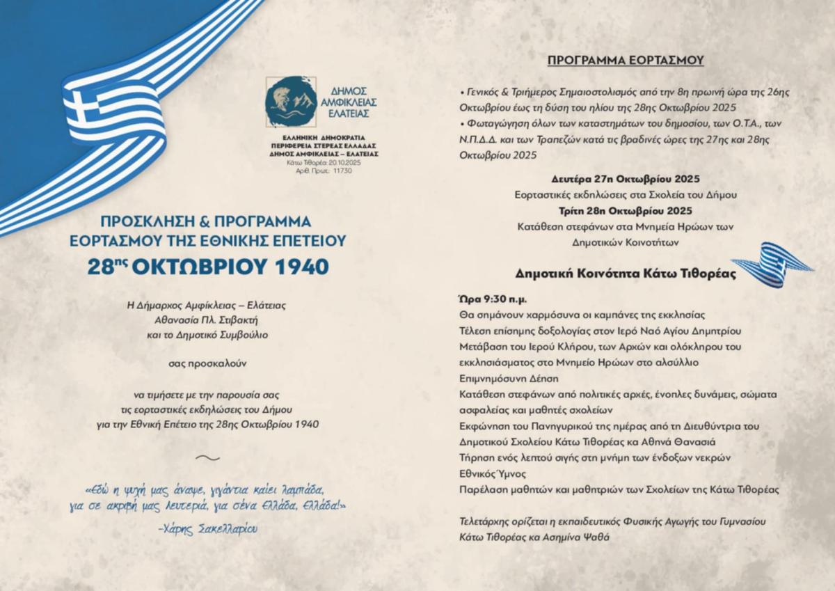 Η Δήμαρχος Αμφίκλειας-Ελάτειας Αθανασία Πλ. Στιβακτή και το Δημοτικό Συμβούλιο σας προσκαλούν να τιμήσει με την παρουσία σας τις εορταστικές εκδηλώσεις του Δήμου για την Εθνική Επέτειο της 28ης Οκτωβρίου 1940 ΠΡΟΓΡΑΜΜΑ ΕΟΡΤΑΣΜΟΥ Γενικός & Τριήμερος Σημαιοστολισμός από την 8η πρωινή ώρα της 26ης Οκτωβρίου έως τη δύση του ηλίου της 28ης Οκτωβρίου 2025 Φωταγώγηση …