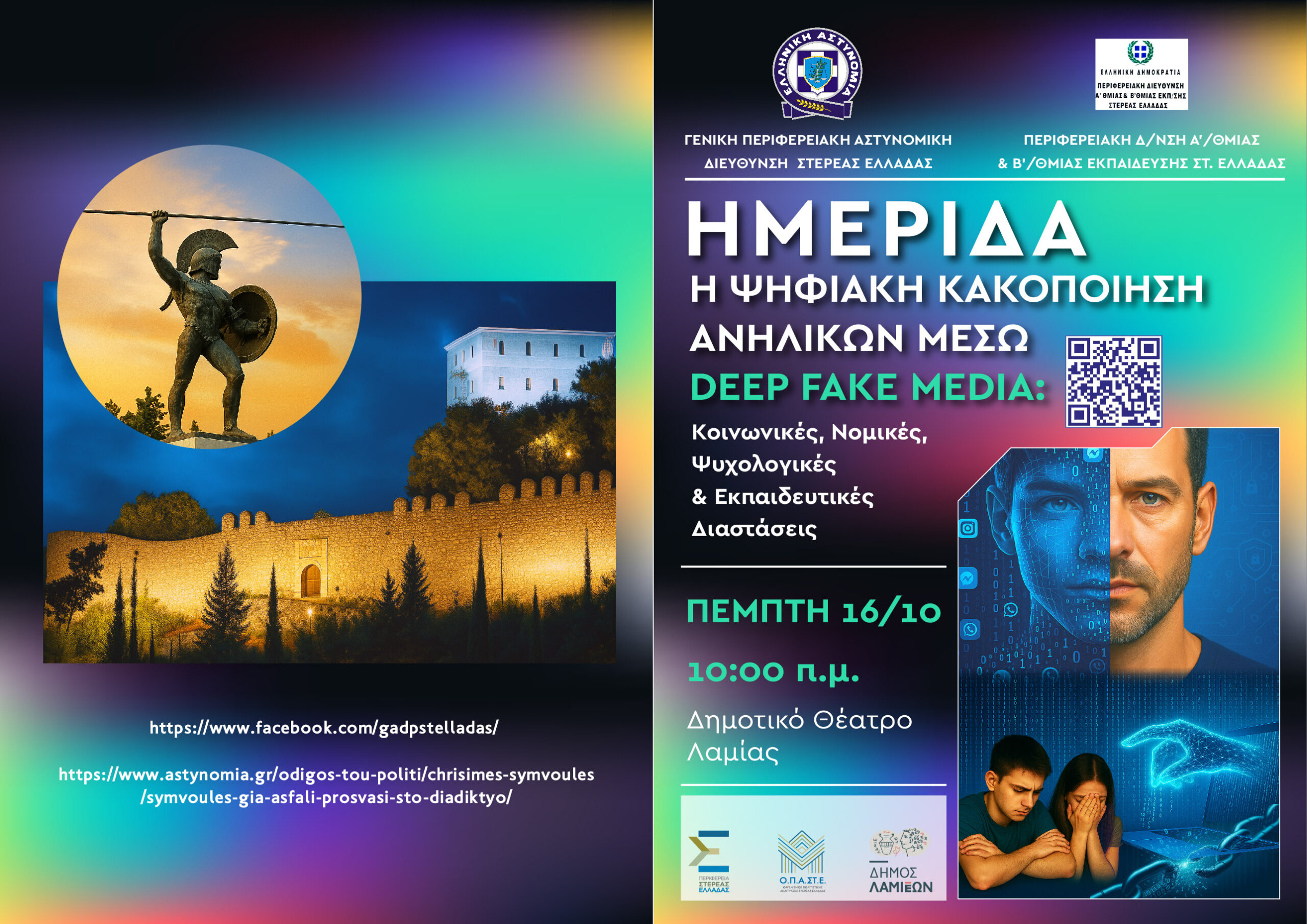 Την Πέμπτη, 16 Οκτωβρίου 2025, το πρωί και ώρα 10:00’, στην αίθουσα του Δημοτικού Θεάτρου Λαμίας, η Γενική Περιφερειακή Αστυνομική Διεύθυνση Στερεάς Ελλάδας και η Περιφερειακή Διεύθυνση Πρωτοβάθμιας και Δευτεροβάθμιας Εκπαίδευσης Στερεάς Ελλάδας, θα συνδιοργανώσουν ενημερωτική Ημερίδα με θέμα:«Η Ψηφιακή Κακοποίηση Ανηλίκων μέσω των DEEP FAKE MEDIA – Κοινωνικές Νομικές, Ψυχολογικές και Εκπαιδευτικές Διαστάσεις». Η …