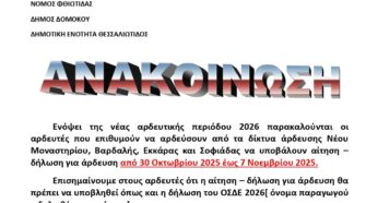 Ενόψει της νέας αρδευτικής περιόδου έτους 2026, παρακαλούνται οι αρδευτές που επιθυμούν να αρδεύσουν από τα δίκτυα άρδευσης Νέου Μοναστηρίου, Βαρδαλής, Εκκάρας και Σοφιάδας, να υποβάλουν αίτηση – δήλωση άρδευσης κατά το χρονικό διάστημα από 30 Οκτωβρίου 2025 έως και 7 Νοεμβρίου 2025. Επισημαίνεται ότι η αίτηση – δήλωση άρδευσης θα πρέπει να υποβληθεί σύμφωνα …