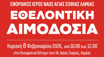 Αιμοδοσία – μια πράξη Αγάπης την Κυριακή 8 Φεβρουαρίου 2026 στο Πνευματικό Κέντρο του Ιερού Ναού Αγίας Σοφίας Λαμίας