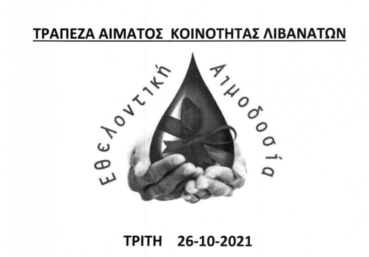 Η Τράπεζα Αίματος Κοινότητας Λιβανάτων διοργανώνει εθελοντική αιμοδοσία την Τρίτη 26-10-2021 στην Αίθουσα του Δημαρχείου Λιβανάτων. Ώρες εθελοντικής αιμοδοσίας από 09:30 το πρωί έως 13:30 το μεσημέρι. Αιμοδοσία, Δώσε Αίμα, Χάρισε Ζωή!