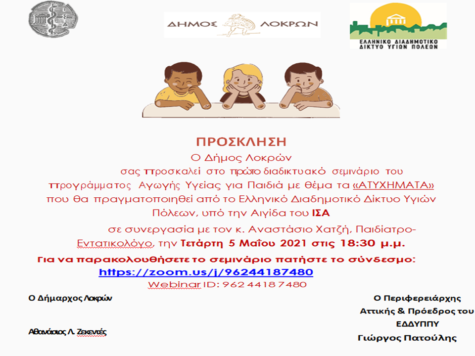Το Ελληνικό Διαδημοτικό Δίκτυο Υγιών Πόλεων-Προαγωγής Υγείας (ΕΔΔΥΠΠΥ) σε συνεργασία με το Δήμο Λοκρών υπό την Αιγίδα του ΙΣΑ, ανακοινώνει την έναρξη του διαδικτυακού προγράμματος «Αγωγή Υγείας για Παιδιά» την Τετάρτη 5 Μαΐου 2021 και ώρα 18:30μ.μ . Οι συμμετέχοντες μπορούν να παρακολουθήσουν το πρόγραμμα που πραγματοποιείται με την υποστήριξη του κ. Αναστάσιου Χατζή, Παιδιάτρου-Εντατικολόγου, τ. Συντονιστή-Διευθυντή ΜΕΘ Νοσοκομείου Παίδων «Η ΑΓΙΑ ΣΟΦΙΑ», Μέλος ΔΣ Ιατρικού …