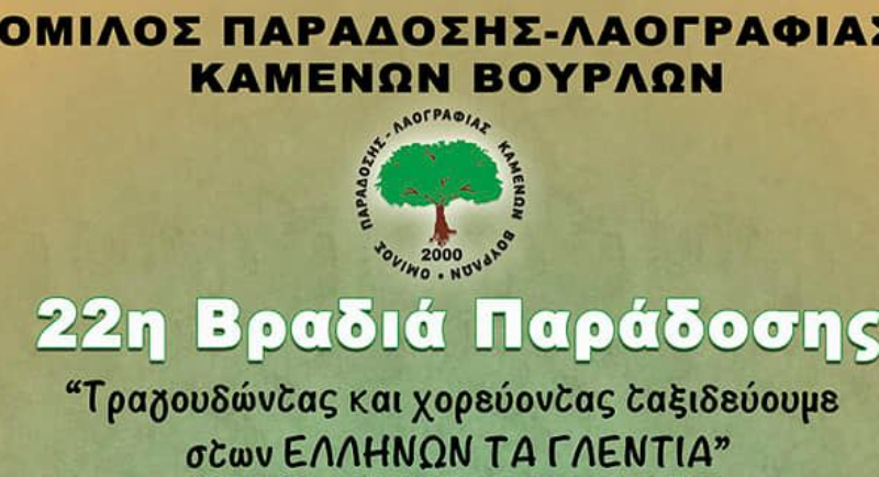 Την «22η Βραδιά Παράδοσης» συνδιοργανώνουν η Περιφέρεια Στερεάς Ελλάδας, ο Δήμος Καμένων Βούρλων και ο Όμιλος Παράδοσης – Λαογραφίας Καμένων Βούρλων, την Πέμπτη 27 Ιουλίου 2023 στις 21:00, στο προαύλιο χώρο του Ι.Ν. Αγίου Παντελεήμονα στα Καμένα Βούρλα. Η φετινή θεματολογία «Τραγουδώντας και χορεύοντας ταξιδεύουμε στων Ελλήνων τα γλέντια» θα έχει να κάνει με τα …